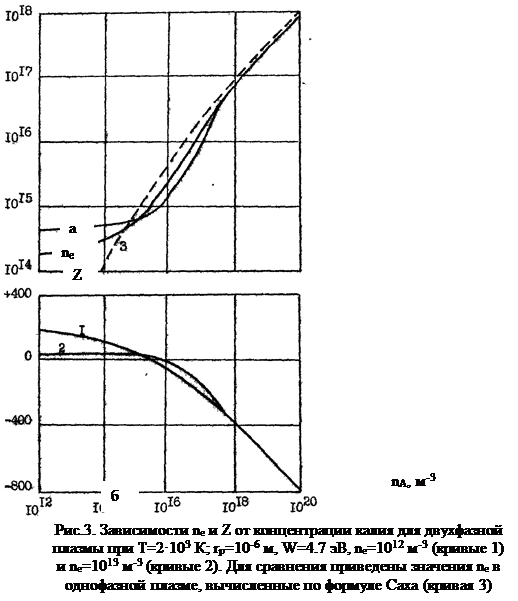 В качестве примера рассмотрим ионизацию атомов калия в аргоне. При неизменной температуре Т плазмы повышение исходного содержания атомов калия nA