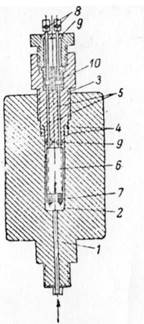 Конструкция датчика манометра сопротивления показана на рис.1. Давление по каналу 1 подводится к полости 2, сверху закрытой гайкой 3с прокладками 4.Внутри гайки проходят два металлических стержня 5, несущие фарфоровый или эбонитовый каркас катушки 6,фиксируемый гайками 7, к которым подключены концы манганиновой обмотки катушки. Для её подключения к мосту (обычно автоматическому электронному уравновешенному) пользуются гайками-зажимами 8.Стержни изолированы от корпуса гайки эбонитовыми втулками 9и прокладками 10.