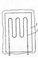 Принцип действия другого чувствительного элемента манометра электрического сопротивления (тензометрического преобразователя) (рис. 2.) состоит в преобразовании усилия или пропорциональной ему деформации в изменение сопротивления проволоки, наклеенной на поверхностьтела, которое подвергается деформации. Тензометр представляет собой тонкую проволоку 1(диаметром от 0,01-0,05 мм), наклеенную на изоляционное основание 2(бумагу или пластмассу). В качестве материала для проволоки используют манганин, нихром, константан и др. К концам проволоки припаивают выводы. В таком виде тензометр наклеивают на поверхность детали, подвергающуюся деформации. При измерении давления изменение сопротивления определяют по формуле (1), где К— коэффициент тензочувствительности. Сопротивление Rчувствительного элемента составляет 80-600 Ом при температуре 20 °С.