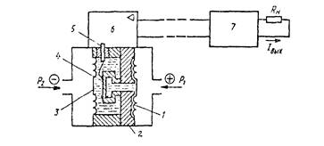 Измеряемая разность давлений P1-P2воздействует на тензомодуль через указанные мембраны и жидкость. Через герметичный вывод 5тензомодуль подключается к встроенному электронному устройству 6. С помощью этого устройства изменение сопротивления тензорезисторов преобразуется в унифицированный токовый выходной сигнал (0 5, 0-20 или 4 20 мА) который передаётся по искробезопасной двухпроводной линии дистанционной передачи к блоку питания 7. Последний устанавливается во взрывобезопасном помещении и обеспечивает питание первичного преобразователя по двухпроводной линии. По этой же линии одновременно передается выходной токовый сигнал. Наряду с указанной функцией блок питания повышает мощность выходного сигнала до уровня, необходимого для подключения внешней нагрузки Rн и формирует заданный уровень выходного сигнала (0-5, 0-20 или 4-20 мА).