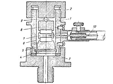 На рис. 4. показана схема датчика пьезоэлектрического манометра. Цилиндрический корпус 1 закрыт с двух сторон крышками 2 и 3, причём нижняя крышка имеет ниппель с резьбой и каналом для соединения с пространством, где измеряется давление. В нижней части корпуса помещена металлическая мембрана 4,на которой установлена шайба 5. На шайбу положена кварцевая пластинка 6с шайбой 7. Ещё выше располагается также кварцевая пластина с шайбой 8, которая прижимается верхней крышкой через шарик 9. Кварцевые пластины расположены так, что положительные заряды приложены к шайбам 5 и 8, а отрицательные к шайбе 7. Заряд с шайбы 7снимается через электрод 10, выходящий наружу через янтарный изолятор.