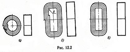 Ленточные магнитопроводы имеют форму круглых (рис. 12.2,а ) или прямоугольных со скругленными углами колец (рис. 12.2,б ) полученных спиральной навивкой на оправку одной ленточной заготовки или П-образной гибкой нескольких предварительно нарезанных полос. Во втором случае кольца получаются разъемными с плоскостью разреза (рис. 12.2, в). Неразрезные ленточные магнитопроводы характеризуются лучшими магнитными характеристиками по сравнению с раз-резными ленточными и пластинчатыми, так как в последних неизбежны воздушный зазор и частичное замыкание торцов. Однако неразрезные ленточные магнитопроводы имеют следующие недостатки: сложность и большая трудоемкость намоточных работ. Достоинством разрезных ленточных магнитопроводов является то, что катушки для них можно изготавливать на обычных намоточных станках.
