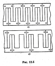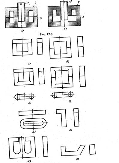 Пластинчатые магнитопроводы представляют собой пакеты, собранные из штампованных плоских пластин. Они бывают двух типов (рис. 12.1): броневые (а) и стержневые (б).