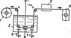 Большое распространение получила суспензия на основе двуокиси кремния, позволяющая получить качественный изоляциояный слой толщиной 5—10 мкм. На рис. 12.6 представлена схема установки для навивки ленточного магнитопроведа с одновременным нанесением изоляции методом электрофоре-за:1—рулон обезжиренной и зачищенной ленты; 2—ванна с суспензией; 3 — мешалки; 4— катоды; 5 — сушильная камера; 6 — оправка для навивки магнитопровода. Толщина и плотность изоляционного слоя определяются режимом навивки, зависящим от концентрации суспензии, скорости прохождения ленты и плотности тока. Число витков магнитопровода контролируется счетчиком.