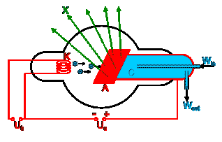 Схематическое изображение рентгеновской трубки. X – рентгеновские лучи, K – катод, А – анод (иногда называемый антикатодом), С – теплоотвод, Uh – напряжение накала катода, Ua – ускоряющее напряжение, Win – впуск водяного охлаждения, Wout – выпуск водяного охлаждения (см. рентгеновская трубка).