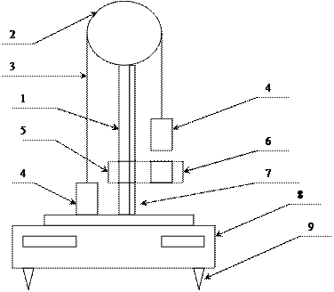 1 – стойка; 2 – блок; 3 – нить; 4 – грузы; 5 – средний кронштейн; 6 – фотодатчик; 7 – линейка; 8 – миллисекундомер; 9 – регулировочная опора.