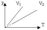 1. На малюнку зображено дві ізобари для двох газів. Гази можна вважати ідеальними. Порівняти тиск Р1 і Р2 . Маси газів постійні.