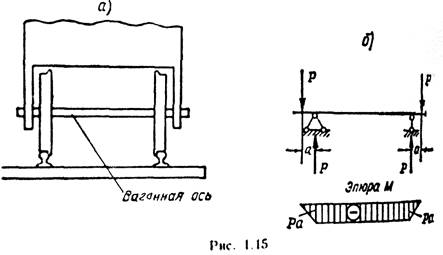 Напряжения, переменные во времени, возникают в элементах конструкций под действием нагрузок, переменных по величине или направлению, а также нагрузок, перемещающихся относительно рассматриваемого элемента. Так, например, вагонная ось изгибается под нагрузкой от веса вагона (рис. 1.15, а). В верхней части каждого поперечного сечения оси возникают нормальные напряжения растяжения (см. эпюру изгибающих моментов на рис. 1.15, 6)