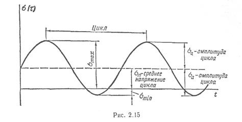 Изменение напряжений во времени можно изобразить с помощью графика, по оси абсцисс которого откладывают время t, а по оси ординат—значения нормальных (или касательных) напряжений. Обычно предполагают, что закон изменения напряжений во времени характеризуется кривой, имеющей вид синусоиды (рис. 2.15).