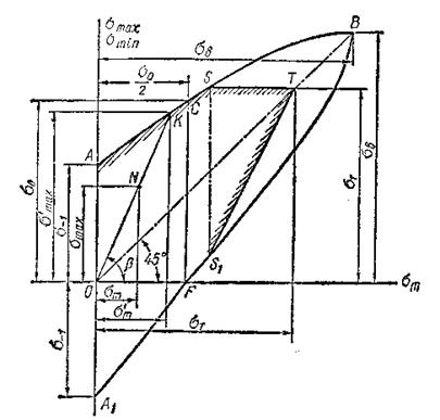 Практически, как показывают многочисленные эксперименты, вид этой кривой не имеет значения; прочность материала при переменных напряжениях зависит в основном от величин наибольшего и наименьшего напряжений.