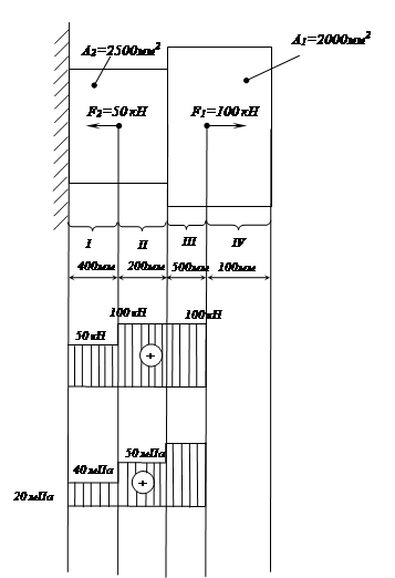 Чтобы определить нормальные напряжения в поперечных сечениях бруса нужно разделить значения продольных сил на площади сечений.