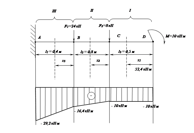 М3 = - М – F2 · (z2 + z3 ) – F1 · z3 = - 10 – 8 · (0,4 + 0,8) – 24 · 0,4 = - 29,2