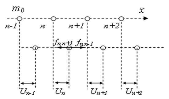 При малых отклонениях атомов от положений равновесия (|u|<<а – расстояние между узлами), силы взаимодействия можно рассматривать как квазиупругие, т. е. пропорциональные изменению расстояния между атомами. Таким образом, силы, действующие на n-й атом со стороны (n – 1)-го и (n + 1)-ro атомов, равны: