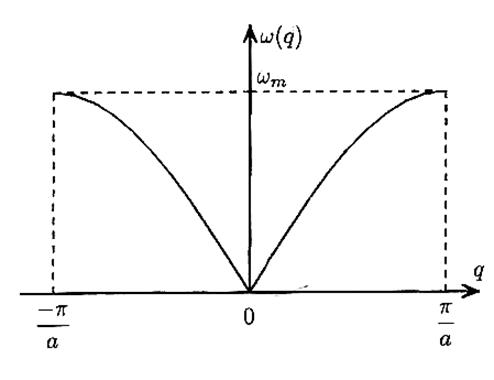 Для цепочки атомов, в отличии от однородной струны, имеет место дисперсия волн, т. е. частота ω зависит от волнового числа q[1]. На рисунке (3) показаны дисперсионные кривые ω(q) для однородной цепочки атомов.