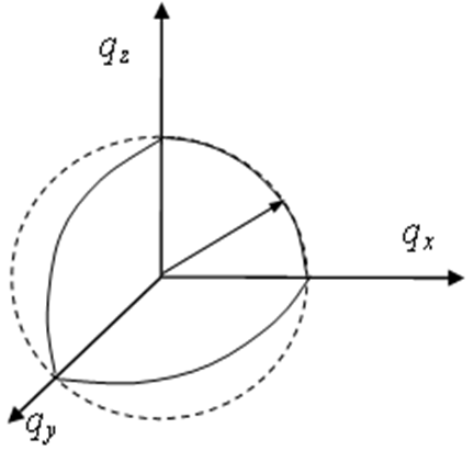 В данном случае воспользуемся свойством изотропности континуума: любое направление в континууме является равновероятным (эквивалентным). В формуле (3) величины qx , qy , qz заведомо положительные, поэтому вероятности отвечает только 1 /8 часть сферы. Объем данной 1 /8 части:
