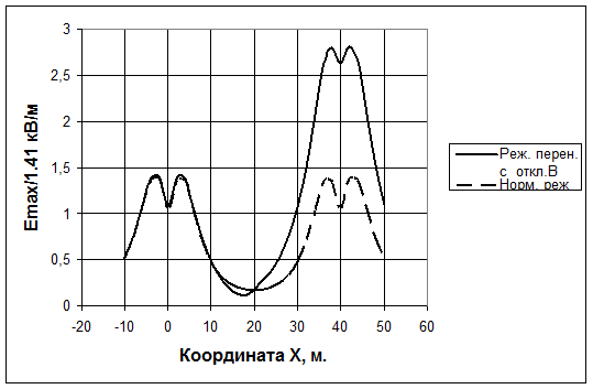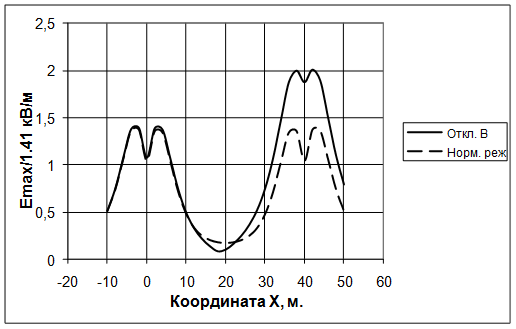 В третьем разделе исследовано электрическое поле создаваемое 16-тью коридорами параллельных ЛЭП, проходящих по территории Костромской области. Для каждого коридора параллельных линий было рассчитано электрическое поле, построены графики зависимости напряженности от координаты X. Расчёты проделаны для нормального режима и неполнофазных режимов при номинальном напряжении и при перенапряжениях.