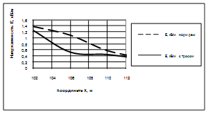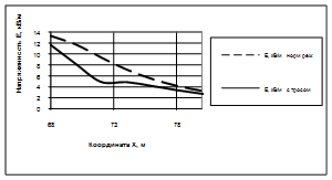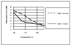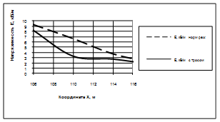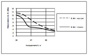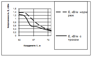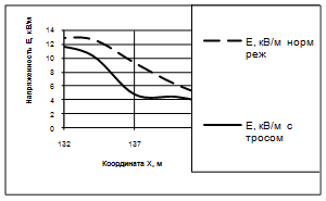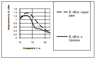 В четвертом разделе исследована возможность экранирования электрического поля с помощью пассивных тросовых экранов. Рассчитано, что при помощи тросовых экранов, расположенных вдоль пролета можно снизить уровень электрического поля в среднем на 45 %.