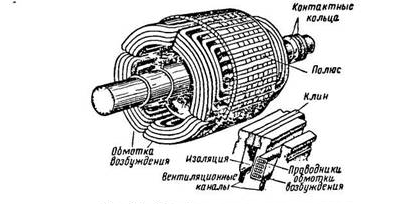 К ободу ротора прикрепляются полюсы, на которые надеваются катушки возбуждения, соединяемые последовательно между собой. Концы обмотки возбуждения присоединяются к двум кольцам, укрепленным на валу ротора. На кольца накладываются щетки, к которым присоединяется источник постоянного напряжения. Обычно постоянный ток для возбуждения ротора дает генератор постоянного тока, сидящий на одном валу с ротором и называемый возбудителем. Мощность возбудителя равна 0,25—1% от номинальной мощности синхронной машины. Номинальные напряжения возбудителей 60—350 В.