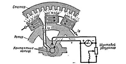 Концы обмотки возбуждения выводят к двум контактным кольцам, расположенным на валу и изолированным как друг от друга, так и от тела ротора.