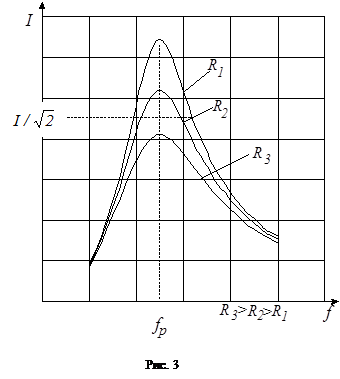 На рисунке 3 показано семейство резонансных кривых при различных значениях активного сопротивления цепи - чем больше активное сопротивление контура, тем менее выражен резонанс.