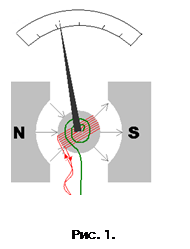 Принцип действия магнитоэлектрического прибора основан на создании крутящего момента, благодаря взаимодействию между полем постоянного магнита и током, который проходит через обмотку рамки. С рамкой соединена стрелка, которая перемещается по шкале. Угол поворота стрелки пропорционален силе тока.