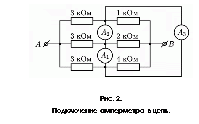 Амперметр – прибор для измерения силы тока в амперах (рис.1). Шкалу амперметров градуируют в микроамперах, миллиамперах, амперах или килоамперах в соответствии с пределами измерения прибора. В электрическую цепь амперметр включается последовательно с тем участком электрической цепи (рис.2) , силу тока в котором измеряют; для увеличения предела измерений — с шунтом или через трансформатор.