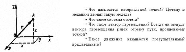 Положение материальной точки определяется по отношению к какомулибо другому, произвольно выбранному телу, называемому телом отсчета. С ним связывается система отсчета — совокупность системы координат и часов, связанных с телом от счета. В декартовой системе координат, используемой наиболее часто, положение точки А в данный момент времени по отношению к этой системе характеризуется тремя координатами x,yuz или радиусомвектором г, проведенным из начала системы координат в данную точку (рис. 1).