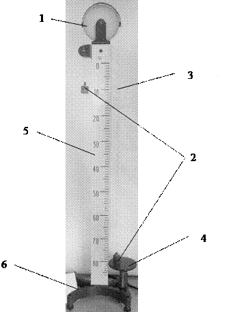 1 – блок, 2 – грузики, 3 – нить, 4 – неподвижная платформа, 5 – стойка со шкалой,