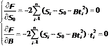 Тогда из равенства нулю частных производных от F по параметрам S 0 и B получим два уравнения