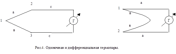 Для абсолютных измерений термопару калибруют по газовому или иному эталонному термометру. Значительно чаще приходится измерять разность температур, тогда применяют дифференциальную термопару. Она представляет собой две одинаковые термопары, включённые навстречу друг другу ( рис.4 ). Спаи помещают в те места, разность температур которых необходимо измерить. Если спай одной из них поместить в среду с известной и стабильной температурой, например, в тающий лёд, то после соответствующей градуировки дифференциальной термопарой можно производить и абсолютные температурные измерения.