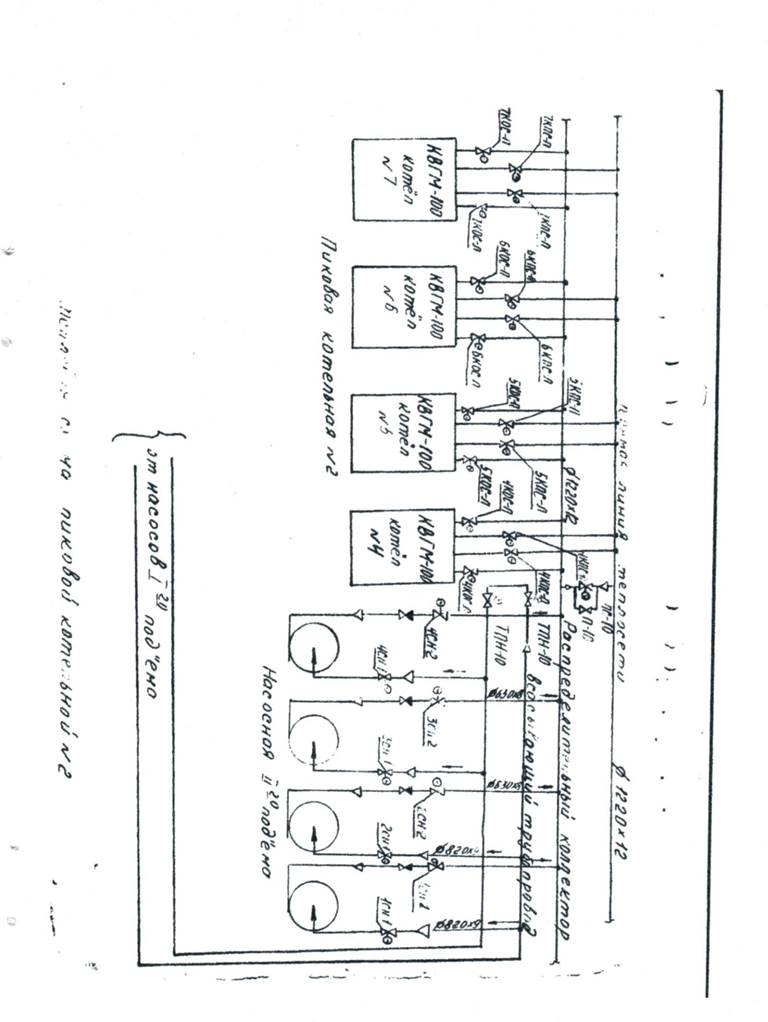 Для создания циркуляции в теплосети с помощью сетевых насосов пиковой котельной (при отключении всех котлов) служит перемычка между распределительным коллектором котлов и прямой линией теплосети с задвижкой П-10.