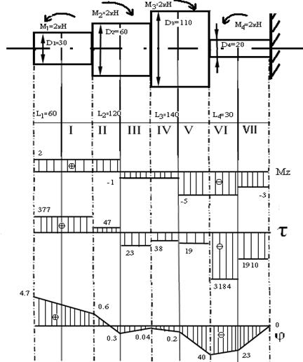 Ступенчатый стальной брус круглого поперечного сечения жестко заделан одним концом и нагружен. как показано на рисунке. Построить эпюры крутящих моментов. максимальных касательных напряжений и углов поворотов поперечных сечений. Проверить прочность бруса при [τk ] – 60Мпа.