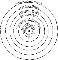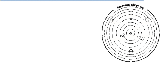 Рис. 6.3. Геоцентрична система світобудови за Птолемеєм. Для пояснення руху планет Птолемей придумав «систему епіциклів». Планета «прикріплена» до невеликої «кришталевої» сфери, а та, у свою чергу, «прикріплена» до великої сфери, у центрі якої розташована Земля. Обидві сфери обертаються, причому кожна має свій період обертання. Спільне обертання сфер, за Птолемеєм, і пояснює незвичайні траєкторії планет