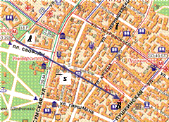 Рис. 6.5. Переміщення s r (позначено синім кольором) показує, на яку відстань від початкового положення і в якому напрямку перемістилося тіло за даний проміжок часу. Точка A — початкове положення тіла, точка B — положення тіла через заданий проміжок часу; l — шлях, пройдений тілом