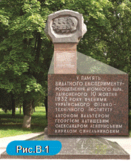 Дослідження в галузі атомної фізики в Україні розпочалися в 1928 році, коли в Харкові, за ініціативою відомого вченого А. І. Іоффе, було створено Український фізикотехнічний інститут (УФТІ). Через кілька років після заснування інституту, у 1932 році, молоді співробітники Антон Вальтер, Георгій Латишев, Олександр Лейпунський і Кирило Синельников уперше в Європі розщепнули ядро атома — це було ядро літію (рис. В-1). У 30-х роках під керівництвом Льва Ландау в інституті починаються теоретичні дослідження атомного ядра та ядерних процесів. Квантова механіка, фізика твердого тіла, магнетизм, фізика низьких температур, фізика космічних променів, гідродинаміка, квантова теорія поля, фізика атомного ядра і фізика елементарних частинок, фізика плазми — у всіх цих галузях фізики Ландау вдалося зробити відкриття. Про нього говорили, що у «величезній будівлі фізики 20-го століття для нього не було замкнених дверей».