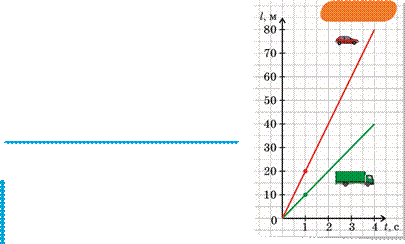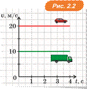 = 1 c (зелена — для вантажівки і червона — для легкового автомобіля на рис. 2.1). Проведемо відрізки прямих через початок координат і ці точки. Ці відрізки і є шуканими графіками.