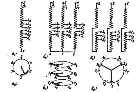 Трансформатор имеет не меньше двух обмоток; из них первичной обмоткой 1 называется обмотка, которая получает энергию преобразуемого переменного тока, вторичными обмотками 2 — обмотки, которые отдают энергию преобразованного переменного тока.