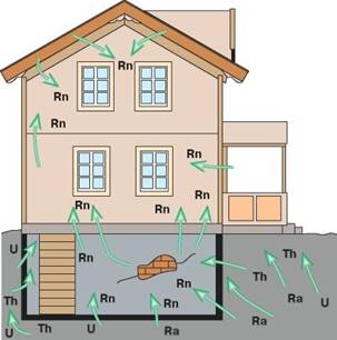 Радон высвобождается из земной коры повсеместно, но его концентрация в наружном воздухе существенно различается для разных точек земного шара. Радон концентрируется в воздухе внутри помещений лишь тогда, когда они в достаточной мере изолированы от внешней среды (рис. 4.). Поступая внутрь помещения тем или иным путем (просачиваясь через фундамент и пол из грунта или, реже, высвобождаясь из материалов, использованных в конструкции дома), радон накапливается в нем. В результате в помещении могут возникать довольно высокие уровни радиации, особенно если дом стоит на грунте с относительно повышенным содержанием радионуклидов или если при его постройке использовали материалы с повышенной радиоактивностью, герметизация помещений с целью утепления только усугубляет дело, поскольку при этом еще более затрудняется выход радиоактивного газа из помещения.
