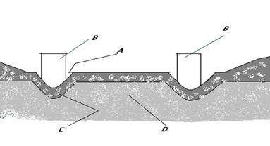 Ледяная дорога; А – колея; В – полоз; С – уплотнённый снег; D – земляное основание дороги.