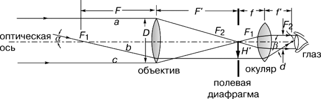 Может быть дополнительная лупа, которая позволяет приблизить глаз к фокальной плоскости и рассматривать изображение с меньшего расстояния, т. е. под большим углом зрения.
