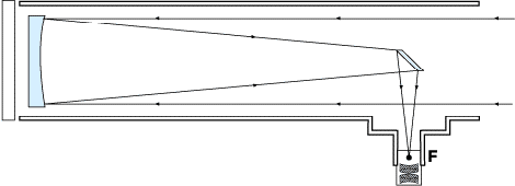 Все большие астрономические телескопы представляют собой рефлекторы . Рефлекторные телескопы популярны и у любителей, поскольку они не так дороги, как рефракторы. Это отражающие телескопы, и для сбора света и формирования изображения в них используется вогнутое главное зеркало. В рефлекторах ньютоновского типа, маленькое плоское вторичное зеркало отражает свет на стенку главной трубы.