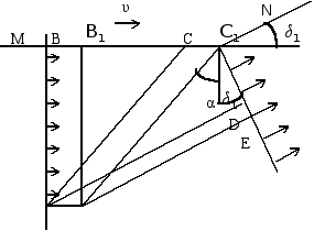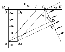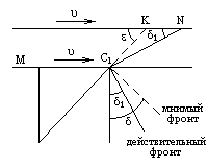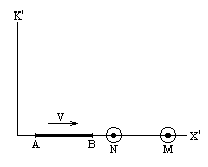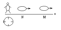 Вроде бы всё совершенно ясно . Но это не так . Мы должны учесть , что когда мы увидели , что тело проходит через место M ,мы на самом деле просто зарегистрировали световой сигнал , приходящий к нам из места M , свидетельствующий о совпадении тела и места M. Так как сигнал распространяется с некоторой конечной скоростью С , то мы должны это учесть и ввести поправку на время распространения сигнала от места M до места N , т.е. поправку на время запаздывания .