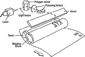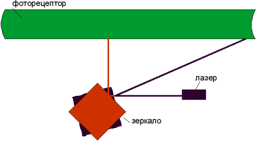 Лазер, управляемый микроконтроллером, генерирует тонкий световой луч, отражающийся от вращающегося зеркала. Этот луч, попадая на фотобарабан, засвечивает на нем элементарные площадки (точки), и в результате фотоэлектрического эффекта в этих точках