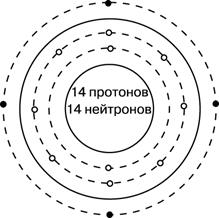 Рис. 1. ЭЛЕКТРОННЫЕ ОБОЛОЧКИ атома кремния, типичного полупроводникового материала. В образовании химических связей и в процессе проводимости могут участвовать только четыре электрона внешней оболочки (темные кружки), называемые валентными электронами. Десять внутренних электронов (светлые кружки) в таких процессах не принимают участия.