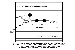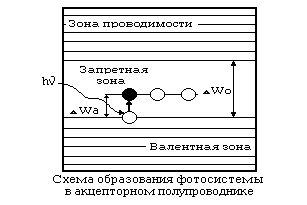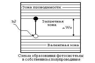 переводит электроны из валентной зоны в зону проводимости. Образующаяся при этом пара электрон-дырка является свободной и участвует в создании проводимости. На рисунке показана схема образования фотоносителей в собственном, донорном и акцепторном полупроводниках. Таким образом, если h
