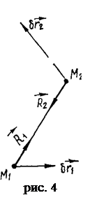 Розглянемо приклад, коли зв'язком для точок М1 і М2 є ідеальний стержень. Надамо точкам віртуальні переміщення (рис. 4) і знайдемо роботу реакцій на цих переміщеннях.