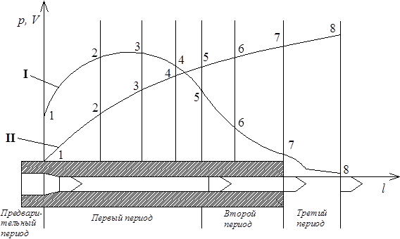В первый подпериод ускорение увеличивается, следовательно, скорость пули будет резко возрастать. Графически это изменение скорости можно представить в виде участка 1-2 кривой II. Во второй подпериод ускорение почти не изменяется, поэтому движение пули будет близким к равноускоренному (участок 3-4 кривой II). В третий подпериод ускорение пули уменьшается, но остаётся положительным, следовательно, прирост скорости пули уменьшается (участок 5-6 кривой II). Во второй и третий периоды происходит дальнейшее уменьшение ускорения, что соответствует уменьшению прироста скорости (участок 7-8 кривой II).