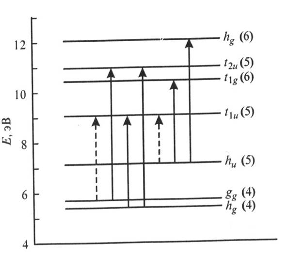 Ниболее сильные переходы в оптическом спектре — зоны D , E + F и G , относящиеся соответственно к дипольно-разрешенным оптическим переходам h g, g g -> t 1u, h u -> h g, h g, g g -> t 2u. Зона D, отвечающая второму и третьему разрешенным переходам, существенно уменьшается в легированных фуллеренах из-за заполнения наинизшего состояния зоны проводимости, созданной молекулярными состояниями t 1u. Молекулярная зона F расщепляется в твердом теле на F1 и F2 вследствие расщепления пятикратно вырожденных уровней h u (h g) на трехкратно и двукратно вырожденные уровни t u (t g), a u (a g). Идентификация двух низших переходов h u - > t 1u и h u -> t 1g более сложна. Молекулярное состояние t 1gh u^-1 представляет собой набор электронно-дырочных возбужденных состояний симметрии T 1u, T 2u, H u, G u.. Нижний разрешенный переход h u -> t 1g в возбужденное состояние Т 1u должен располагаться около 3 эВ, причем сила осциллятора должна составлять около 3 % от перехода при 3.5 эВ. В дополнение к этому переходу в этой же энергетической области должны наблюдаться фононно-индуцированные переходы сравнительной силы в возбужденные состояния Т 2u, Н u, G u, составляющие группу В. Группа А отнесена к электронно-дырочному состоянию t 1gh u^-1, которое запрещено по четности в изолированной молекуле, но становится частично разрешенным из-за расщепления уровней. Группа гамма происходит от запрещенного молекулярного перехода h u -> t 1u.. Эти переходы проявляются вследствие возбуждения нечетной колебательной моды, и высшие электронные состояния этой группы должны зависеть от ян-теллеровского искажения.