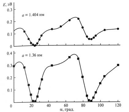 Рисунок 4 . Полная энергия на молекулу как функция угла поворота в структуре Pm 3 m для двух различных постоянных решетки: a =1.404 нм соответствует атмосферному давлению, а=1.36 – внешнему давлению 1.5Гпа.