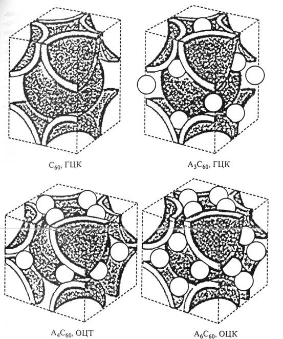 При внедрении атомов примеси в фуллеритовую матрицу могут происходить два процесса. В первом случае атомы примеси распределяются в кристалле в виде отдельных кластеров. Для фуллеренов характерно другое явление, а именно интерполяция атомов примеси в решетку фуллерита. Интеркаляционные соединения представляют собой материал, в котором атомы или молекулы примеси захвачены между слоями кристаллической решетки. Формально химическая связь между интеркалянтом и матрицей отсутствует. Процессы интеркаляции широко изучаются, например, в графите, где атомы примеси внедряются в пространство между плоскостями решетки графита, не деформируя саму структуру кристалла. Интеркаляция атомов примеси в решетку фуллерена происходит несколько иначе. Фуллерены представляют собой трехмерный тип интеркаляционных соединений. Диаметр молекулы С60 велик по сравнению с размерами большинства элементов периодической таблицы. Следствием является очень большая для кристаллов, состоящих из атомов одного сорта, постоянная решетки (а = 1.42 нм; для сравнения в кремнии а = 0.54 нм, в германии а = 0.57 нм); для высших фуллеренов а еще больше. Из-за этого в межмолекулярные пустоты кристалла С60 могут внедряться, не деформируя решетку атомы примеси. Тем не менее не все элементы могут формировать объемные интеркаляционные соединения. В основном это щелочные, щелочноземельные и редкоземельные металлы. Решающим фактором при этом является сумма работ выхода металла Е f и энергии когезии Е kog. Если эта сумма меньше уровня низшей незаполненной молекулярной орбитали E lumo, то энергия интеркаляции Е инт = E lumo - Е kor - E f положительна и создание трехмерных интеркаляционных соединений возможно. При интеркаляции примеси в фуллереновую матрицу могут создаваться структуры, представленные на рисунке 5 . Интеркаляция может существенно влиять на физические и электронные свойства материала. Процесс интеркаляции характеризуется большим переносом заряда от атома примеси к молекуле С60 (в случае легирования фуллеренов щелочными металлами происходит полный перенос заряда к С60 — следствие низкого потенциала ионизации атомов щелочных металлов). При этом велик интеграл перекрытия волновых функций атома примеси и С60. При интеркаляции будет повышаться проводимость за счет атомов, поставляющих свои пи -электроны, причем проводимость будет резко зависеть от того, какие позиции заняты этими атомами. В случае щелочных металлов этот эффект проявляется очень сильно. Электрические свойства таких композитных соединений зависят от количества атомов щелочных металлов, приходящихся на элементарную ячейку С60. На каждую молекулу имеется 1 окта-эдрическая и 2 тетраэдрические пустоты. С60 имеет большое сродство к электрону, щелочные металлы легко отдают электроны.